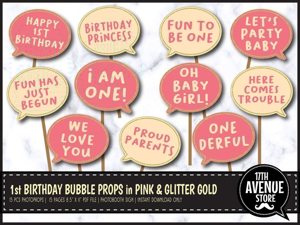 1ST BIRTHDAY BUBBLE PHOTO BOOTH PROPS IN PINK AND GLITTER GOLD.