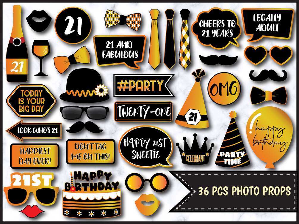 21ST BIRTHDAY PHOTO BOOTH PROPS IN BLACK AND GOLD DUST